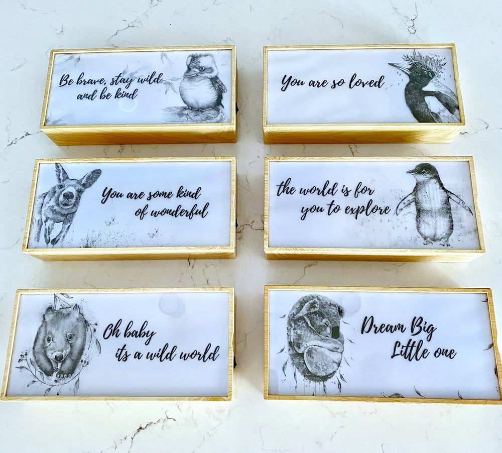 These beautiful and totally unique night lights are just divine. They feature a series of Aussie animals that are toooo cute. They are totally unique and make a gorgeous gift or keep them yourself to brighten up anyone’s room. They come with batteries and can be hung on a wall or popped on a table or ledge. Made sturdy and strong with no glass just a durable Perspex. They emit a soft glow at night nothing too strong and during the day they are a beautiful art piece