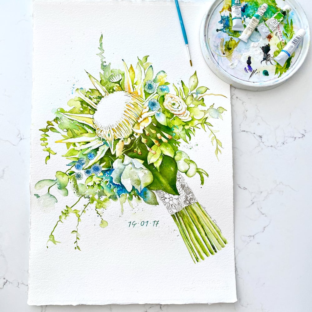 Simply send me a photo of your wedding bouquet and anything that you would want to be included in the painting (wedding date, names etc.) I will send you the preview before shipping (I can also send working sketch).